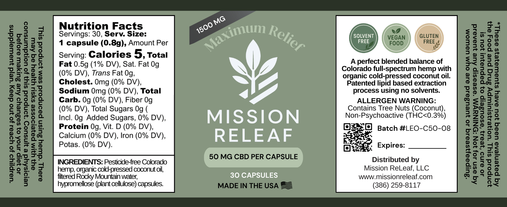 - Ingredients: Pesticide-free Colorado hemp, organic cold-pressed coconut oil, filtered Rocky Mountain water, hypromellose (plant cellulose) capsules ALLERGEN WARNING: Contains Tree Nuts (coconut).